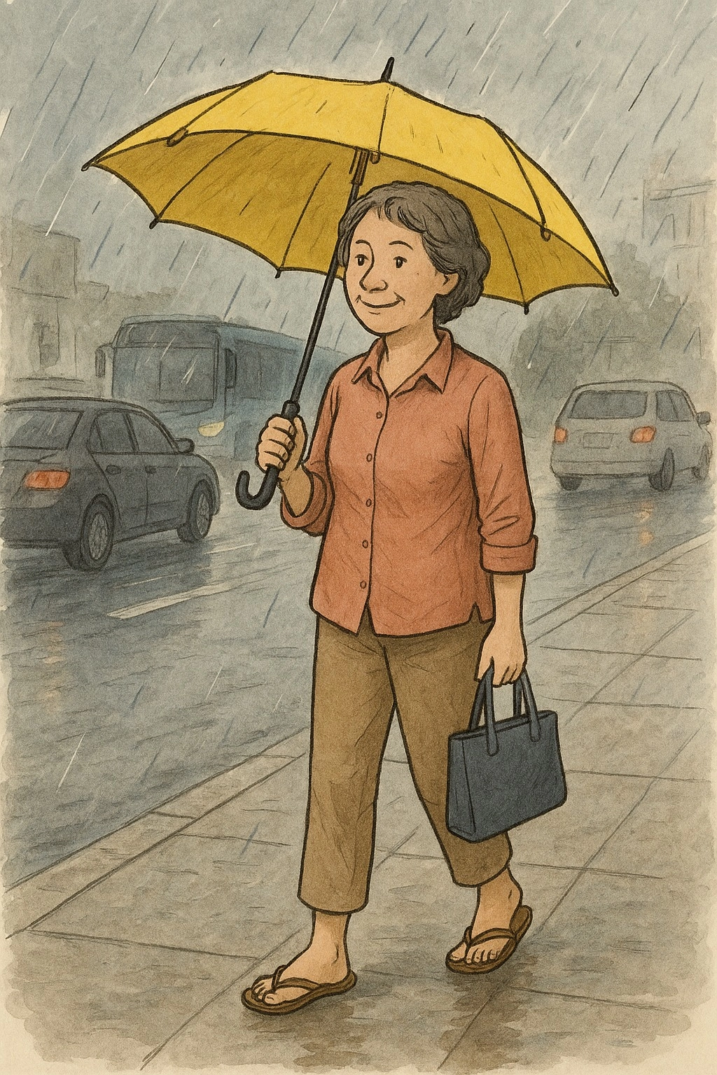 O dia estava nublado e ela carregava na bolsa uma sombrinha, amarela. Sua cor favorita. Um dos luxos que permitia na sua vida. Comprou-a num impulso, num dia totalmente ensolarado, por puro prazer de comprar. E era sua companheira de enfrentamento dos dias chuvosos.
