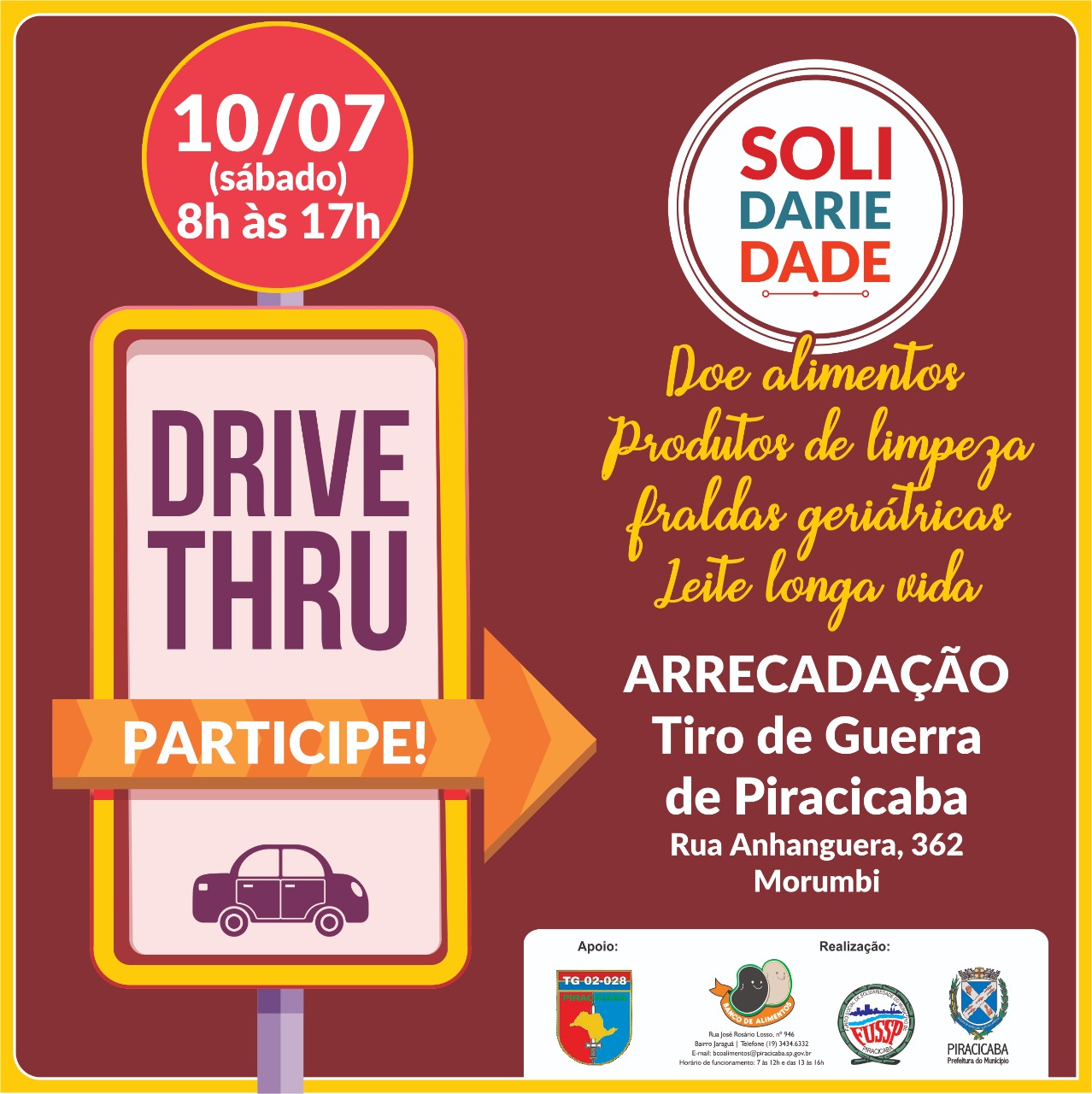 No sábado, 10/07, o Tiro de Guerra de Piracicaba e o Fundo Social de Solidariedade de Piracicaba (Fussp) promovem um drive-thru para arrecadação de produtos de higiene, fraldas geriátricas, leite longa vida e alimentos. A ação integra a campanha Prato do Dia: Solidariedade – Doe Alimentos acontece no Tiro de Guerra de Piracicaba, das 8h às 17h.